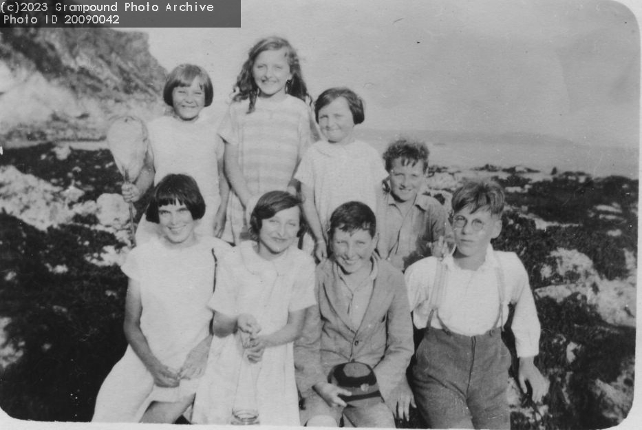 Party of children at Charlestown c1929. The girls on the left are (rear) Barbara Allen (now Tregunna) and (front) Molly Allen both of Grampound. Molly Allen died of tuberculosis at the age of 16.