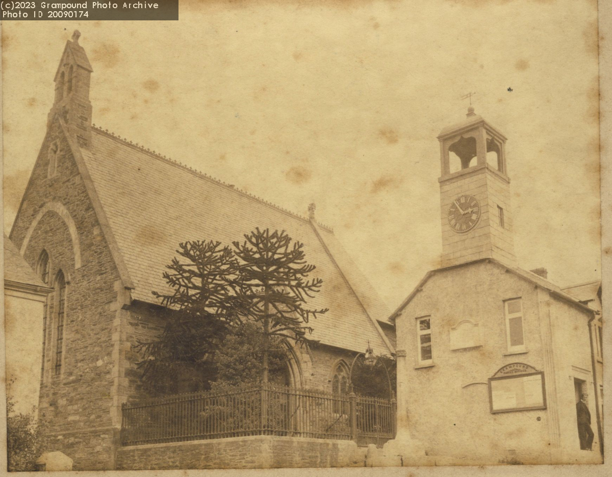 The Town Hall and St Nun's Church showing the new clock and plaque but not the War Memorial; this places this photograph between 1894 and 1918.