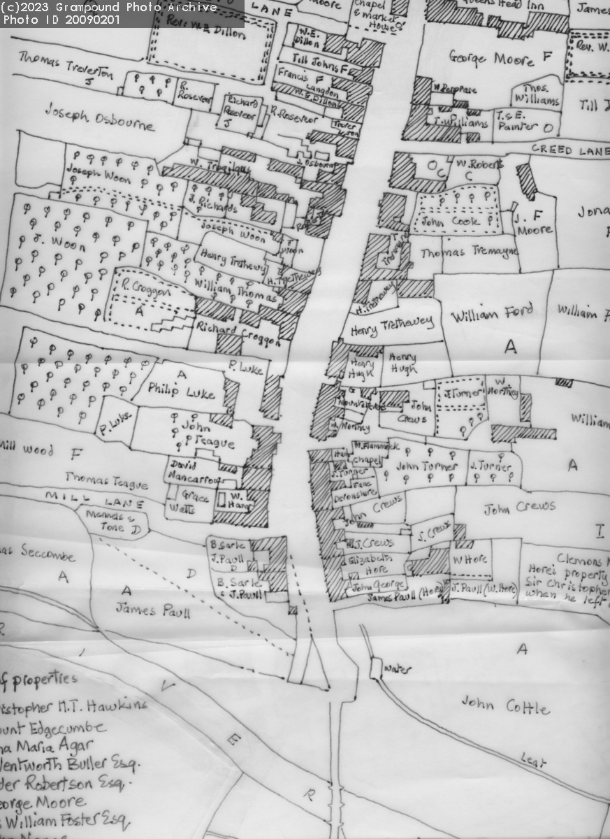 Tracing of a map of Grampound made by Mary Oliver. The original map was drawn by H St Aubyn in 1831 and it shows the ownership/lessees of property at that time. This shows Lower Fore Street on Creed side.