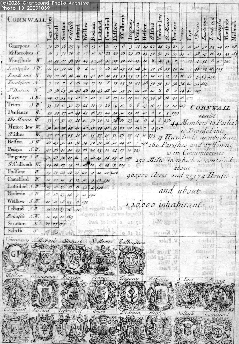 Chart giving distances between principal towns in Cornwall, MPs, Hundreds etc. Date unknown.