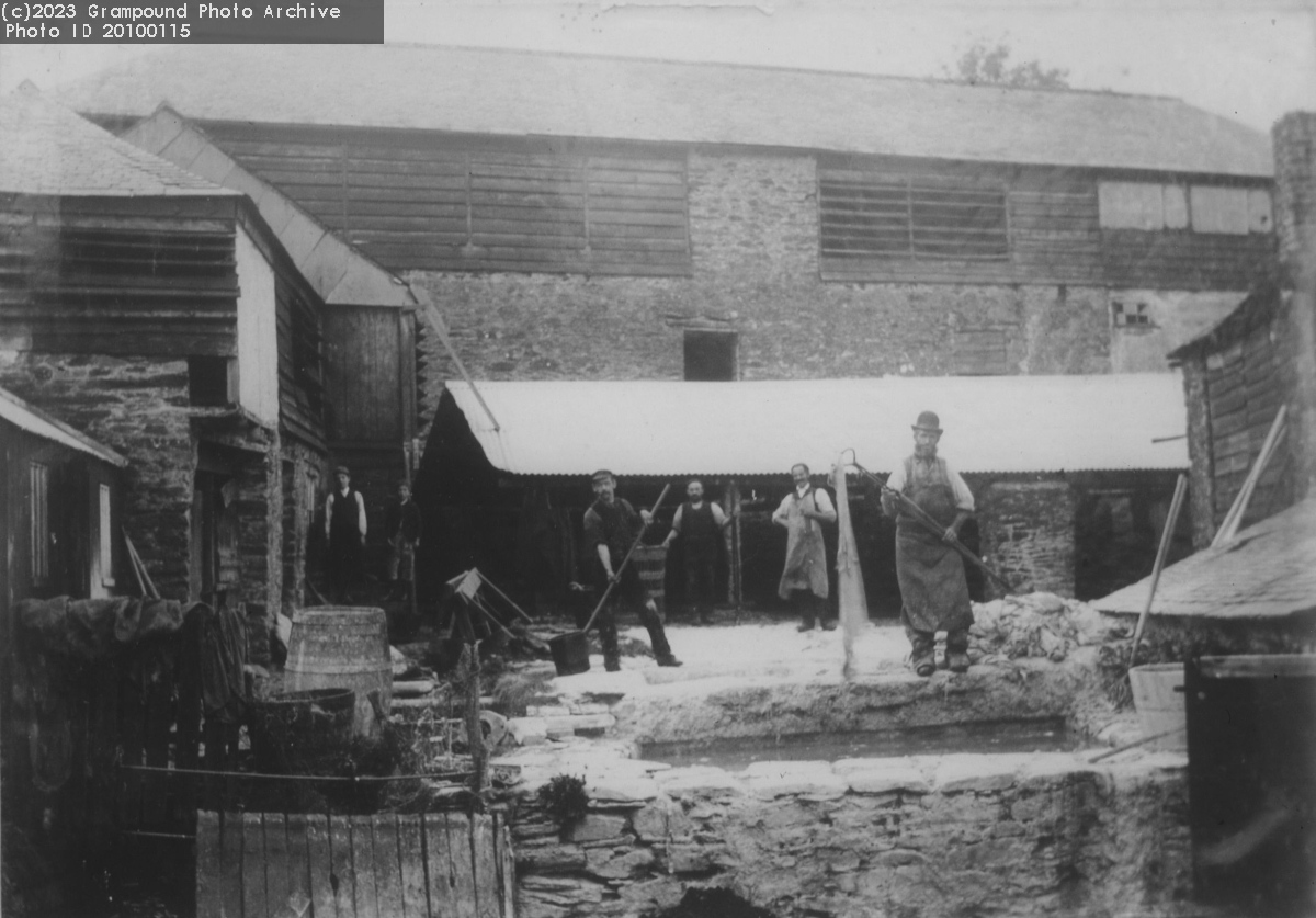 R Bennett and Son tannery, date unknown. The Nancarrow family previously owned this tannery. It stood where Fal Valley Pets now is (2008) - opposite the junction of Old Hill and the A390. The curing pits were in the open yard in front of the present buildings. It was also a slaughterhouse and, unlike Croggons, dealt with sheep skins as well as cow hides. Jack Juleff worked for this tannery for fifty years; Jack was one of the six children of Eva Juleff (nee Mannell) who lived at Trengoffe on Old Hill between the wars.