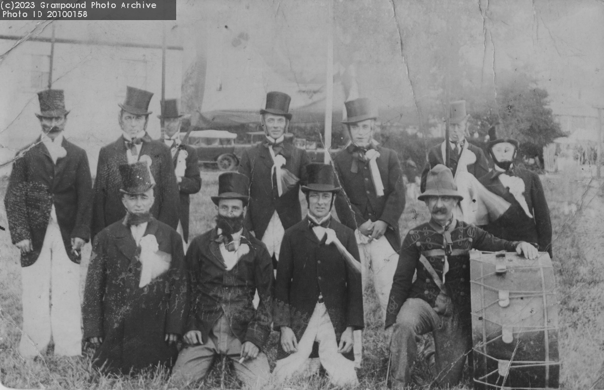 Men of the village in fancy dress for the Carnival - date possibly c1920s. The costume is turn of the century and there are some old vehicles in the background.