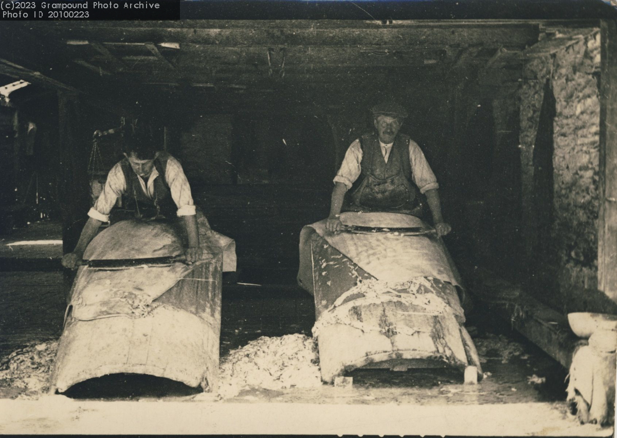 Father Jack (John) and son Cyril Allen at the Manor Tannery working hides on the 'beams'.