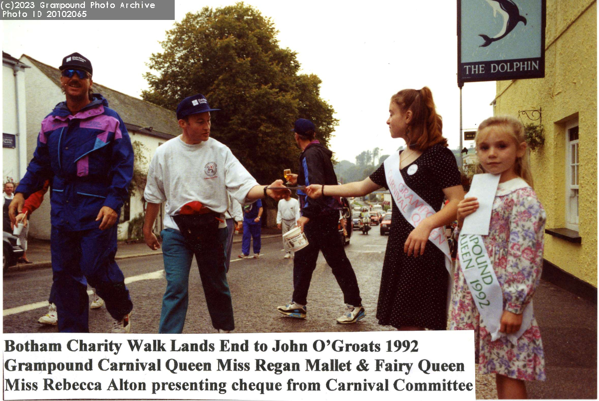 Charity Walk Lands End to John O'Groats 1992. Regan Mallet, Carnival Queen presenting a cheque from the Carnival Committee with Rebecca