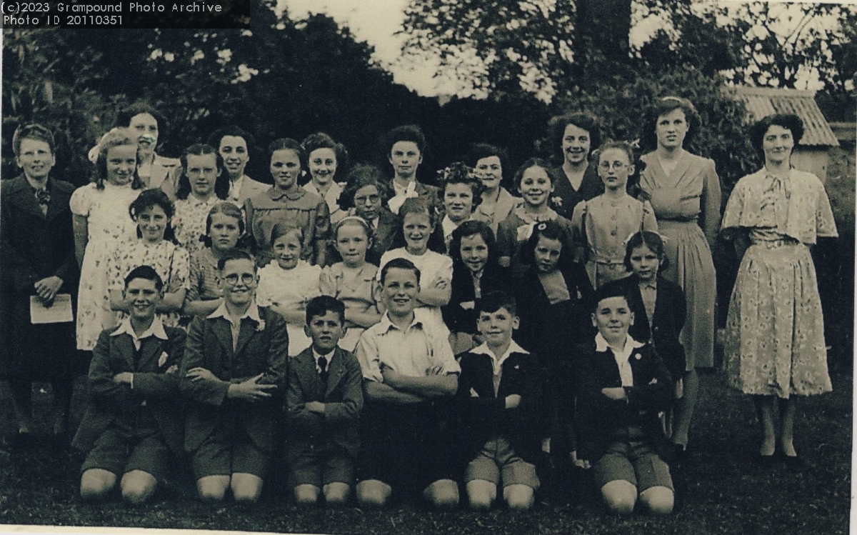 Grampound Children's Choir c1945. Back row (l to r) Miss Kitty B Richards (Conductor), Miss Rona Teague, Stella Juleff (Mannell), Jean Juleff (Hicks), Annie Knowles, Doreen Mannell, Audry Thomas (Way), Elsie Mannell, Mrs Williams (Pianist). Second row (l to r) Shirley Chapman (Way), Beatrice Kendall, Betty Snell, Patsy Bennett (or Nancy Roberts), Jill Matta, Sally Olver (Varcoe), Jeanette Bawden. Third row (l to r) Joan Richards, Valerie Cock (Cundy), Iris Richards, Joan Mannell (Priddle), Jenny Horton(Rowe), Maureen Mannell, ? Spry, Wendy Olver. Front row (l to r) John Few, Keith Richards, Michael Biddick, Gordon ?, Raymond Mannell, Vivian Mannell. Missing from photo is Roger Paynter.