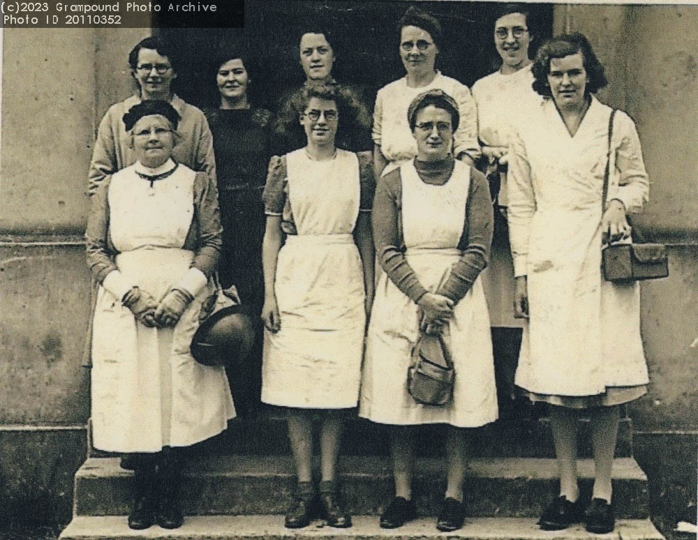 First Aid Post during World War Two. Back row (l to r) Mrs Allen, Doreen Mannell, Molly Ellis, Mrs Landrey, Rona Teague. Front row (l to r) Nurse Harris, Pauline Ellis, Mrs Olver from Carwinnick Farm, Ida Nettle.