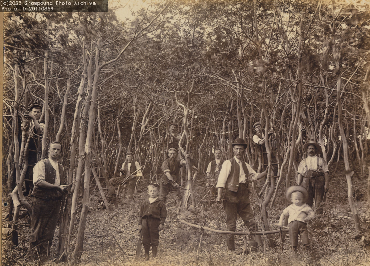 This photo was donated by Geoff Jones, who is a member of the Knowles family of Grampound. It is probably late 19th or early 20th century and the location is thought to be Bosillion Lane. It shows coppiced oak being harvested prior to having its bark stripped to make tanning liquor for the Manor Tannery. This was called rinding bark.