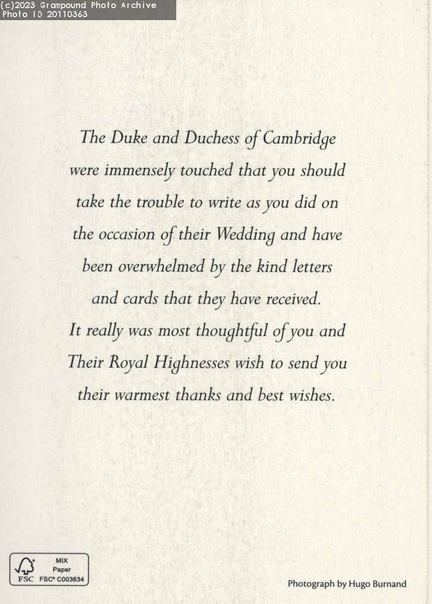 On the occasion of their marriage on 29th April 2011, the Grampound with Creed Parish Council sent a letter of congratulation to Kate Middleton and Prince William of Wales. On the morning of the wedding, it was announced from Buckingham Palace that their Royal Highnesses were to be styled 'Duke and Duchess of Cambridge'. Whenever the Duchess was referred to by her Christian name in the days after the wedding, it became accepted practice to call her 'Catherine'. She will be the sixth Queen Consort of England since 1066 to bear this name. This is their reply to the Grampound with Creed Parish Council letter.