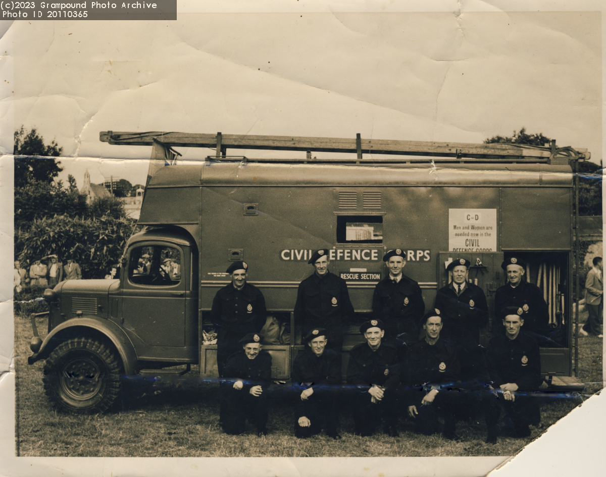 Grampound Civil Defence Corps 1940s. Back row - Charlie Ford, Vernon Richards, ? King, Billy James, Donald Mitchell. Front row - Ernie Ford, Elvean Blake, Jack Bickle, Sid Honey, Jack Richards. This is probably just after the end of the war. Photograph by Negus, East Hill, St Austell.