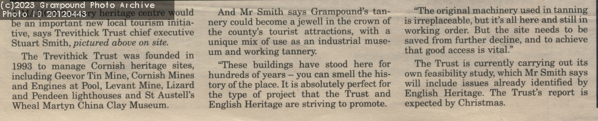 Cornish Guardian November 2000 - at the time the Manor Tannery ceased production. Discussion about use of site as a Heritage Centre.