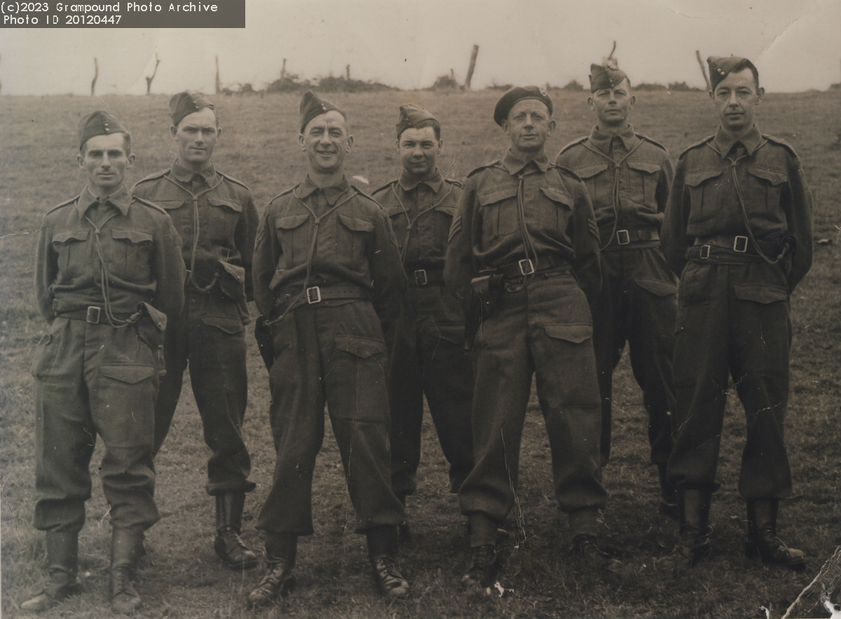 Grampound Auxiliary Unit WW2. As with the Home Guard, the Auxiliary Units were civilians not regular soldiers but they were trained to a higher level of technical capability and it was envisaged that in the event of an invasion, they would harass and obstruct the enemy advance significantly. They were given professional training in the tactics of guerrilla warfare. They remained very secret during and well beyond the end of the war. The Grampound Auxiliary Unit had the task, in the event of an invasion, of blowing up Grampound Bridge in order to obstruct the movement of enemy troops, transport and heavy armour. They had an operational base at the north end of Trewithen Woods, now known as Barteliver Wood. Featured in this photograph are (l to r) WJ (Jack) Richards of Fore Street, HG (Harold) Cock of Moors View, Cpl SA (Sidney) Honey of Fore Street, WJM (John) Osbourne of Ringmore House, Sgt WJ (William) Knowles of Old Hill, CA (Clem) Knowles of Old Hill, IEE (Ire) Broom of Old Hill. Note that they are all carrying revolvers. More information about the Auxiliary Units can be found at Coleshill Auxiliary Research Team - http://www.coleshillhouse.com/ -.