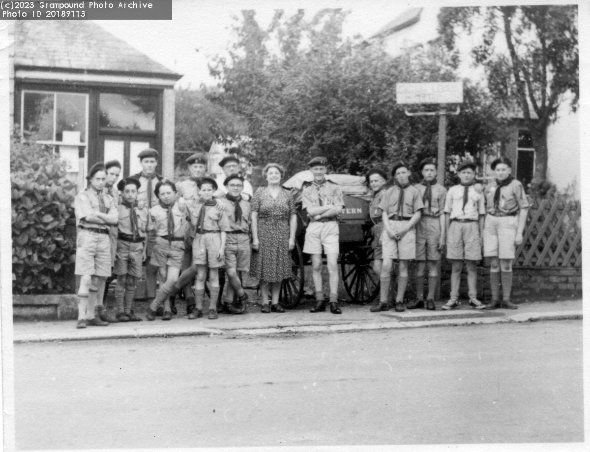 Scout troop outside the small barber's shop attached to Trevail. 1950's?