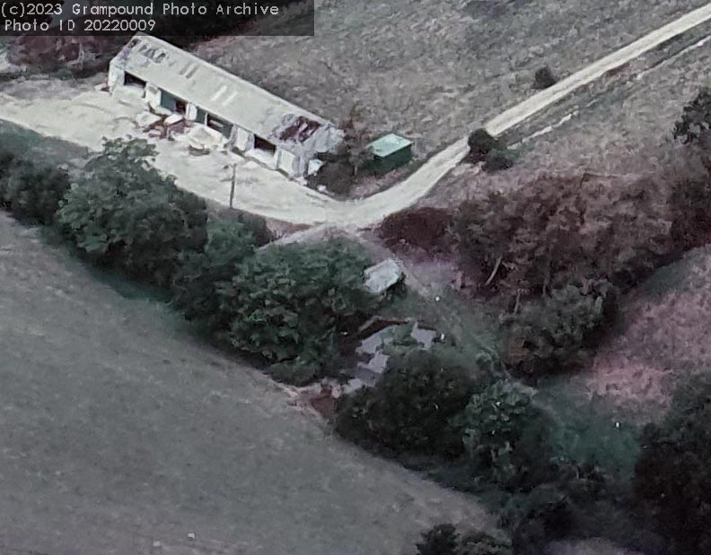 An aerial view of the old limes area of the Manor Tannery circa 1980s taken from a full sized aerial photograph. The outline of the pond is visible. The long building was demolished when the new estate was built.